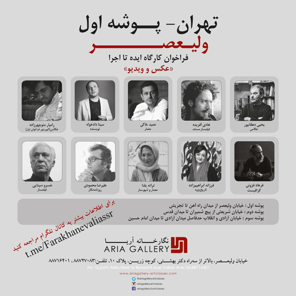 نگارخانه آریا در نظر دارد با همکاری هنرمندان در حوزه عکس و ویدیو شریان های اصلی و مهم شهر تهران را بر اساس اهمیت فرهنگی، اجتماعی و سیاسی آن در سه محور و در سه دوره زمانی مختلف، در قالب برگزاری دورههای کارگاهی معرفی و بازنمایی کند. در پایان این دوره، نمایشگاهی از آثار منتخب شرکت کنندگان در این دورهها برگزار خواهد شد.