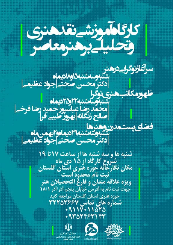 با تلاش و همت واحد هنرهای تجسمی حوزه هنری گلستان ، کارگاه آموزشی تئوری هنرهای تجسمی با موضوع "سرآغاز نوگرائی" با حضور جواد عظیمی و دکتر محسن صحتی در این مرکز برگزار می شود.
