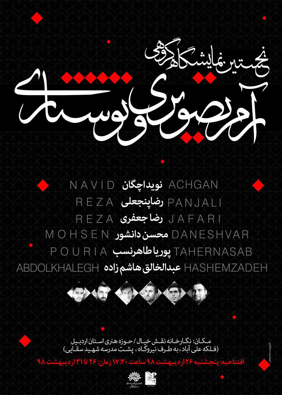نخستین نمایشگاه گروهی طراحی آرم تصویری و نوشتاری، روز پنج‌شنبه 26 اردیبهشت ماه 1398 ساعت 17:30 در نگارخانه نقش خیال حوزه هنری اردبیل گشایش خواهد یافت.